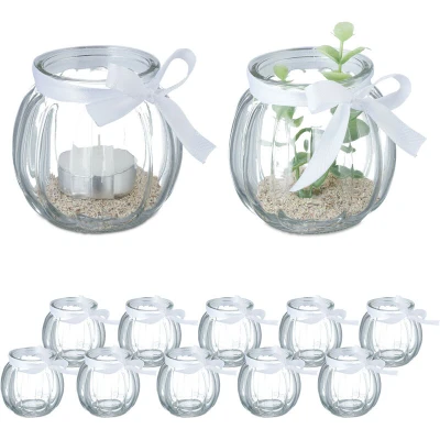 Relaxdays Candle Holders, Set of 12, Glass, Jar with Bow, Tealight Table Decor, 7.5 x cm, Indoors & Outdoors, Clear