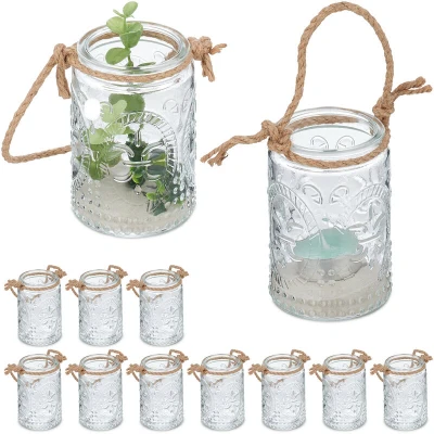 Amazon MarketplaceSet of 12: Transparent lanterns for tea lights with vintage design - With cord handle for hanging Use: Candle holders as decoration for weddings, garden parties or summer evenings on your balcony Basics: Round tea light holders made of glass and hemp - Size per glass H x D: approx. 10.5 x 7 cm Ambient: Outdoor lanterns create a cosy atmosphere - Watch the light flickering through the glass Versatile: Ideal for DIY fans - Glass lanterns can be filled with sand, stones, flowers and more