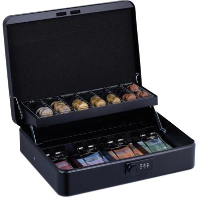 General description If you want to store cash safely, this Relaxdays cash box is the right choice. It is suitable for use at home as well as at flea markets, fairs, and other events. The cash box features a removable coin tray that allows you to sort coins by value, ensuring you always have an overview of your cash. Secured with a 3-digit combination lock, it can be easily transported using the carrying handle. Technical specifications Dimensions (H x W x D): 8.5 x 30.5 x 25 cm Weight: approx. 2 kg Material: iron, ABS, steel Color: black (available in various colors) Installation Set your password by turning the combination lock to position 0-0-0. Slide the lever on the lock from position A to position B. Turn the combination lock to your new desired password. Move the lever from position B back to position A. Usage Suitable for storing cash, ID cards, and other documents. Coin insert allows for quick sorting and removal of coins. Ideal for private use, markets, school events, and