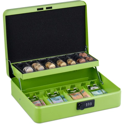 General description If you want to store cash safely, this money counting cassette is the right choice. The cash box is suitable for use at home as well as at flea markets, fairs, and other events. You can sort coins by value in the removable coin tray, ensuring you always have an overview. The savings bank is secured with a 3-digit combination and can be easily transported using the carrying handle. Technical specifications Dimensions (H x W x D): 8.5 x 30.5 x 25 cm Weight: approx. 2 kg Material: iron, ABS, steel Installation Set your password: Turn the combination lock to position 0-0-0. Slide the lever on the lock from position A to position B. Turn the combination lock to the new, desired password. Move the lever from position B back to position A. Usage Suitable for cash, ID cards, and other documents. Coin insert for quick sorting and removal. Easy to transport thanks to the retractable carrying handle. Sturdy design made of robust iron with powder coating. Other information