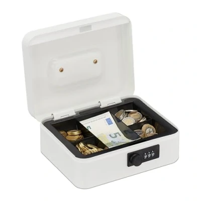 AmazonSecure: Cash box with individually adjustable 3-digit number combination lock - In glossy white Organised: Cash box with removable coin insert - simply organise notes and coins Versatile: Cash box for safely storing money and documents - For home, flea markets and other events Sturdy: Metal box is made of robust iron with a shiny coating - Dimensions HWD: 8.5 x 20 x 17 cm Portable: Cash box with practical carrying handle for easy transport - Retractable when not in use