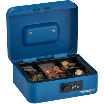 AmazonSafe: Cash box with individually adjustable, 3-digit combination lock - Secure cash storage Clever: Thanks to the coin counting board, it's simple to keep an overview - insert for banknotes Versatile: Blue coin box as team cash box in the club, for companies or private use Handy: Easy transport thanks to the handle - Also ideal to take along to events Details: Money storage made of sturdy steel - H x W x D: approx. 8.5 x 20 x 17 cm