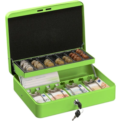 AmazonSafe: Lockable cash box with 2 keys - perfect for storing loose change and notes - In green Clever: Thanks to the coin counting board, it's simple to keep an overview - insert for banknotes Versatile: Coin box as team cash box in the club, for companies or private use Handy: Easy transport thanks to the handle - Also ideal to take along to events Details: Money storage made of sturdy steel - HxWxD: approx. 8.5 x 30.5 x 24.5 cm