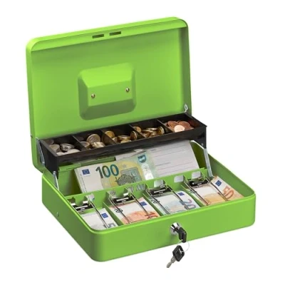 Safe: Lockable cash box with 2 keys - perfect for storing loose change and notes - In green Clever: Thanks to the coin counting board, it's simple to keep an overview - insert for banknotes Versatile: Coin box as team cash box in the club, for companies or private use Handy: Easy transport thanks to the handle - Also ideal to take along to events Details: Money storage made of sturdy steel - HxWxD: approx. 8.5 x 30.5 x 24.5 cm