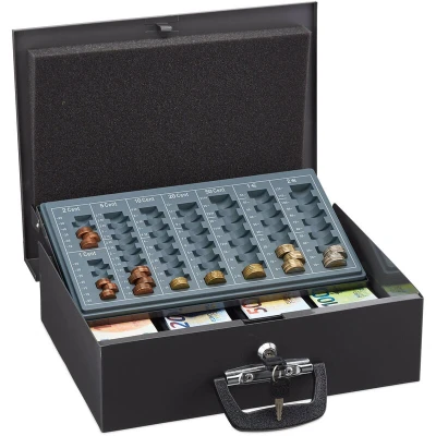Amazon MarketplaceSecure: Cash box with lock and 2 keys - Secure money and documents storage - In grey colour Organised: Cash box with coin tray and 4 note compartments - Notes and coins are easy to organise Versatile: Cash box for safely storing money and documents - For home, flea markets and other events Sturdy: Metal box is made of robust iron with a shiny coating - Dimensions HWD: 11.5 x 36 x 28.5 cm Portable: Handy cash box with practical carrying handle for easy transport - Ideal for taking along