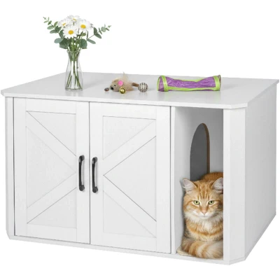 AmazonUse: Large litter tray cabinet for discreet, hygienic concealment Retreat: Cat cabinet with front entrance – Use as a cosy cat cave Cleanliness: Cat cabinet with hygienic litter mat – Traps litter – Easy to clean Versatile: Cat litter cabinet doubles as shelf or storage for cat accessories and décor. Basics: Sturdy white cat litter cabinet - HxWxD: approx. 50x85x49 cm - Suits any home