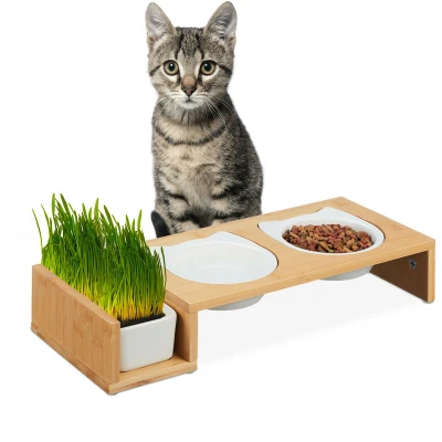 Relaxdays Cat Feeding Station, with Pet Grass, 2 Ceramic Bowls 400 ml Each, Dishwasher Safe, Stand, Natural/White, Bamboo, 8.5 x 47.5 19 cm