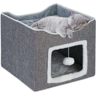 General description The Relaxdays Cat House is a cozy retreat designed for your feline friends, providing a comfortable space for relaxation and sleep. With two sleeping areas, it is ideal for multiple cats. The foldable design allows for easy storage when not in use, making it a practical addition to your home. Technical specifications Dimensions (H x W x D): approx. 32 x 40 x 40 cm Max. load: approx. 25 kg Weight: approx. 1.8 kg Material: Cotton, Polyester, MDF Colour: Grey Cat cave dimensions (H x W x D): approx. 18 x 38.5 x 39 cm Cave entrance dimensions (H x W): approx. 15 x 21 cm Upper cat bed dimensions (H x W x D): approx. 10 x 38.5 x 38 cm Side scratching area dimensions (H x W): approx. 22 x 14 cm Usage Provides a cozy hideaway and sleep spot for cats Includes 2 soft, fluffy cushions for added comfort Features a convenient scratching surface for nail trimming Play ball included to encourage exploration and play Other information Quickly assembled cat hideaway Folds up and