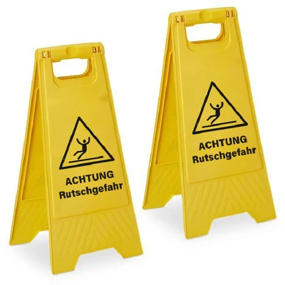 AmazonWarning: Warn passers-by of slipping hazard with 2-piece sign set on freshly mopped floors. Practical: Double-sided 'Caution – Slippery' sign, warning visible from both sides. Usage: Warning sign for slippery floors, ideal for residential buildings, offices, shops and more. Compact: Practical folding warning sign – folds flat for space-saving storage Details: Yellow plastic sign printed "Caution: Slippery Floor" - HWD: approx. 59x29x23 cm