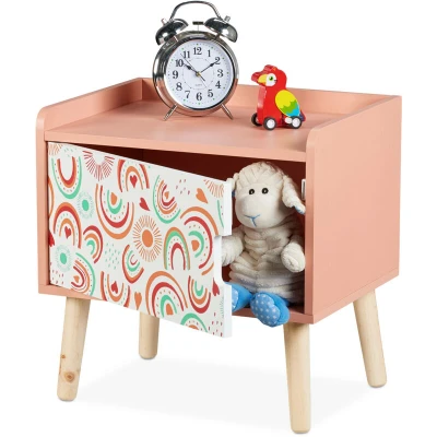 Relaxdays Children's Bedside Table, Rainbow, Kids Nightstand with Cupboard, HWD 41x40x30 cm, Wood & MDF, White/Pink