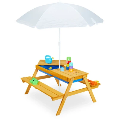 General description This wooden picnic bench provides a child-friendly seating option for the garden. Your little ones can sit down independently, paint, or enjoy their own picnic. Under the removable table tops, there are two blue plastic tubs designed for playing with water and sand. The included parasol ensures that children stay in the shade while they creatively splash around at the water play table. Enjoy quality time outdoors with this versatile children's garden table! Technical specifications Dimensions of the seating set (H x W x D): approx. 49 x 86 x 92.5 cm Seat height: approx. 29 cm Load capacity of table: 30 kg Load capacity of seat: 60 kg Weight: approx. 8.1 kg Material: Fir wood, polyester, plastic (PP) Colour: Natural Table surface dimensions (W x D): approx. 92.5 x 35 cm Tub inner dimensions (H x W x D): approx. 8.5 x 35 x 28 cm Seat surface dimensions (W x D): approx. 92.5 x 17 cm Parasol dimensions (H x D): approx. 156-165 x 128 cm Installation Assembly required;
