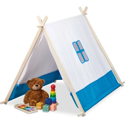 Relaxdays Children's Play Tent, with Window & Door, Wigwam, HWD: 92 x 86 120 cm, Indoor, Wooden Frame, Blue/White, Polyester