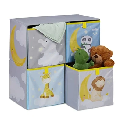 AmazonChild-friendly: Colourful children's room shelf including 4 folding boxes with a cute animals Storage space: In the children's shelf you can store toys, books, clothes etc. in no time at all Tidy: Your children will learn to tidy up easily with this practical toy organiser Motif: Toy boxes with elephant, panda, giraffe and lion - moon and clouds decorate the shelf sides Dimensions: Shelf HxWxD: app. 59.5 x 60.5 x 30 cm - Folding boxes each HxWxD: app. 29 x 30 x 30 cm