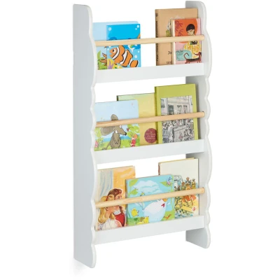 General description This children's bookshelf in a charming cloud design is an excellent tool to encourage your little ones to read. The open design allows even toddlers to select and remove books independently, while the covers of books and magazines are displayed facing forward for clear visibility. This decorative wall shelf fits harmoniously into any child's room, making it suitable for both girls and boys. Technical specifications Dimensions (H x W x D): approx. 80 x 42.5 x 14 cm Internal compartments (H x W x D): approx. 23.5 x 40 x 10 cm Rod dimensions (W x D): approx. 40 x 2 cm Load capacity per compartment: max. 2 kg Weight: approx. 3.7 kg Material: MDF, pine wood Colour: White, natural Installation Thanks to the included mounting kit, you can easily hang the bookshelf in no time.