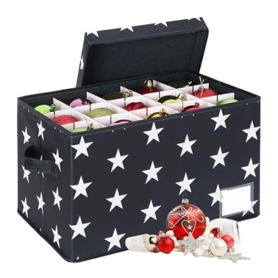 Storage space: Sturdy Christmas ornament box with lid – for baubles and other festive decorations Design: Grey Christmas bauble box with star motif – creating a festive mood while decorating Division: Ornament box for 30 ornaments - Adjustable dividers for various tree decorations Practical Christmas bauble box with label slot for quick ID and handles for easy transport Details: Christmas bauble box made of durable polyester and cardboard – size: 26.5 x 42.5 x 26 cm