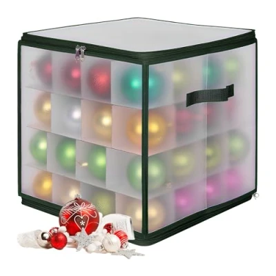 AmazonStorage: Durable storage box with zips for Christmas baubles and other festive decorations Design: Ball box for 64 balls - HxWxD: approx. 36 x 36 x 36 cm - With decorative accents in green Division: Christmas bauble box with adjustable dividers for ornaments of various sizes Features: Semi-transparent ornament box for easy viewing - With handles for comfortable transport Organisation: Christmas ornament box for tidy and safe storage of tree decorations