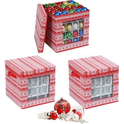 AmazonStorage: Set of 3 lidded boxes – for Christmas baubles and decorations Appearance: Red-and-white bauble boxes with festive Norwegian pattern – adds festive cheer Division: Christmas bauble boxes with adjustable dividers for different-sized baubles Practical: bauble boxes with clear windows for quick overview and carry handles for easy transport Christmas bauble boxes, sturdy non-woven fabric & cardboard, approx. 33×33×33 cm (HxWxD)