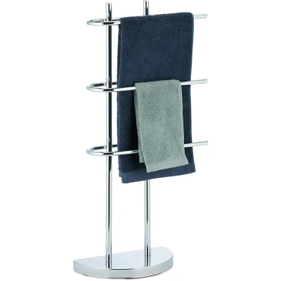 General description A towel holder is a basic necessity if you want your towels ready and in reach without having to leave ugly drill holes in your walls. This modern towel rack can do all that and save you the hassle. Just use it wherever you need it most. This lovely 3-tier piece impresses with its high-quality look and simple nature. Technical specifications Total size H x W x D: 83 x 40 x 18 cm Size of base H x W x D: 3 x 32.5 x 18 cm Length of each rail: 34 cm Material: Chrome-plated iron, plastic Weight: 3.1 kg Other information Heavy plastic base protects your floor while providing firm footing Half-round base for stability Shiny and stainless surface Base does not leave any scratches Included in delivery: 1 x Towel Stand in pieces, assembly materials, instructions Decorative items shown in product photos are not included