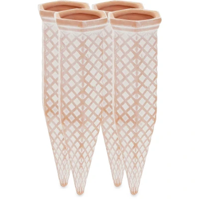 Planning on going on holiday this year but your plants need watering whilst you’re away? Then these 4 watering stakes are the perfect solution for you! Simply stick a 1.5 L plastic bottle filled with water in the watering spike and stick the spike into the soil. As soon as the soil becomes too dry, water will soak through the permeable material ensuring uniform watering. So you can go about your plans while knowing your plants are taken care of. Clay Cones in Detail - Dimensions H x W x D: approx. 18 x 5.5 x 5 cm - Opening W x D: approx. 4 x 3.5 cm - Weight: approx. 130 g each - Material: Ceramic - Colour: Terracotta Watering Spikes for Plant Pots - Suitable for house plants, outdoor plants, raised beds etc. - Automatically supplies plants with water for a few days - The watering stakes fit wine and plastic bottles of up to 1.5 L - Water-permeable clay releases water as needed - Perfect for when you go on holiday or those who lead busy lives - Terracotta with decorative white check