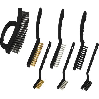 General description Equipped with this cleaning set of 7 brushes, you can easily clean your home and garden. The set includes 2 nylon brushes, 2 stainless steel brushes, and 2 brass brushes, all available in 2 different sizes. Additionally, it features a steel wire brush with a handle, making it versatile for various cleaning tasks. Whether dealing with accumulated rust on metallic parts, tools, or jewelry, this complete brush kit is designed to tackle all kinds of stains and dirt. The nylon brush is particularly useful for cleaning workspaces and keyboards. Technical specifications Total size of mini brushes: approx. 17.5 cm long Handle size (W x D): 13.5 x 1 cm Bristles size (H x W): approx. 1.3 x 3 cm Weight of mini brushes: approx. 20 g Total size of maxi brushes: approx. 22 cm long Handle size (W x D): 12.5 x 2 cm Bristles size (H x W): approx. 1.3 x 9 cm Weight of maxi brushes: approx. 40 g Total size of wire brush with handle (H x W x D): approx. 7.5 x 16 x 3.5 cm Handle size