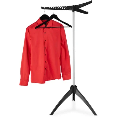 General description This practical clothes drying rack is ideal for hanging clothes hangers. Whether you want to hang your jumpers, T-shirts, and dresses to dry or are looking for a place to hang your blouses and shirts while you iron, the compact 3-armed wardrobe provides plenty of space. Hangers hang securely in the 33 notches and 30 holes. When not in use, the clothes stand folds away for easy storage. Technical specifications Dimensions unfolded (H x D): approx. 129 x 62 cm Folded dimensions: approx. 106 x 15 cm Load capacity: approx. 5 kg Weight: approx. 1 kg Material: ABS plastic, iron Colour: Black/Grey Usage Ideal for drying shirts, dresses, jumpers, T-shirts, and more Can be used indoors and outdoors Easy to transport thanks to its low weight