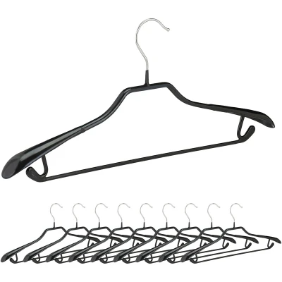 General description These Relaxdays clothes hangers are designed specifically for hanging suit jackets and trousers, featuring a convenient trouser rail. The non-slip coating ensures that garments stay securely in place, while the rounded, wide outer edges help maintain the shape of the shoulders, preventing wrinkles. Technical specifications Size H x W x D: approx. 19.5 x 44 x 3 cm Width rail: approx. 32.5 cm Weight: approx. 140 g Material: Metal with PVC coating Colour: Black and silver Other information Included in Delivery: 10 x suit hangers Decorative items shown in product photos are not included