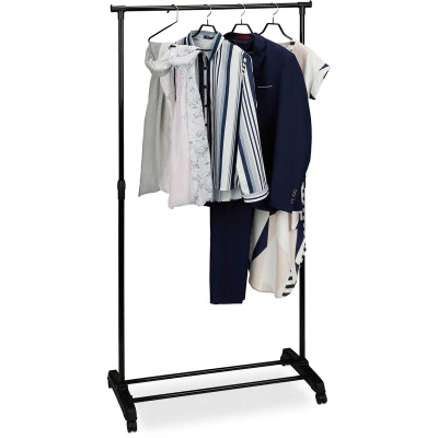 General description If you need extra storage while moving or want to keep your outfits crease-free for a fashion show, this Relaxdays Clothes Rack on Wheels is the perfect solution. It allows you to hang jackets, shirts, and blouses on the clothes rail while utilizing the shelves for shoes, bags, and other items. The height of the movable coat stand can be continuously adjusted, and with its four wheels, it can be easily moved from one location to another. Technical specifications Height adjustable from 102.5 cm to 180.5 cm Dimensions at highest position: 180.5 x 91 x 42 cm Dimensions at lowest position: 102.5 x 91 x 42 cm Clothes rail dimensions: 78.5 x 2.1 cm Shelf dimensions: 77 x 19 cm Bottom poles diameter: 1.9 cm Distance between poles: 15 cm Weight: 1.4 kg Capacity: 10 kg Material: Iron, plastic Color: Black Included in Delivery 1 x Clothes Rack in pieces Instructions Decorative items shown in product photos are not included