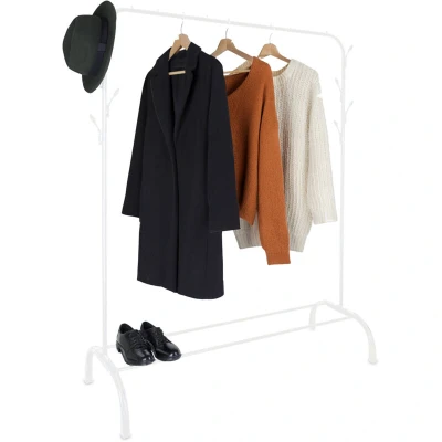 Relaxdays clothing rack, HxWxD: 148 x 110 40 cm, shelf, hooks & rail, metal, coat stand, white