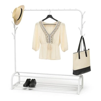 AmazonOrganise: White coat rack with rail, 2 shelves and 8 hooks for your garments Stable and sturdy: the robust iron construction of the coat rack supports up to 30 kg reliably. Space-saving: open coat rack with shoe shelves and hooks optimises every inch of space Modern design: sleek metal fits any décor and offers a tidy appearance Flexible: Lightweight at just 2.8 kg, easy to move - Simple assembly with included instructions