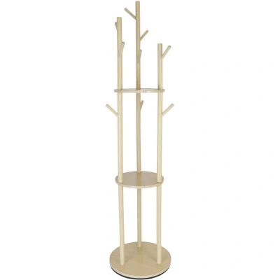 General description This round coat rack helps you keep your hallway tidy and organized. With its natural aesthetic, the pine wood coat rack is a real eye-catcher. The space-saving design is particularly suitable for smaller entrance areas, making it a functional and stylish addition to your home. Technical specifications Overall dimensions H x D: approx. 165 x 40 cm Hook length: approx. 9.5 cm each Shelf spacing: approx. 54 cm Load capacity: approx. 25 kg Material: pine wood, MDF Colour: natural Usage The 9 hooks offer ample space for jackets, hats, and scarves. Three shelves provide additional storage for bags and other items. Thanks to the swivel base, your clothes and accessories are always within easy reach. Free-standing and individually positionable, suitable for the hallway, office, etc. Other information Included in delivery: 1x coat rack in parts, including assembly materials. Decorative items are not included in the delivery.