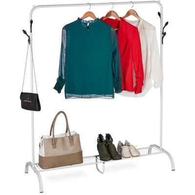Relaxdays Coat Rack Metal, Shoe & Bag Shelf, 6 Hooks, Clothes Rail Bedroom, HWD: 145 x 132 44 cm, Free Standing, White, Steel