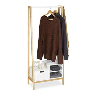 For storage: Spacious wardrobe stand and hallway shelf in one - With drawer and compartments Details: Sturdy natural bamboo and white MDF - H x W x D: app. 139.5 x 64.5 x 31 cm Storage solution: With coat rail and side hook for coats and jackets Freestanding: Can be freely positioned - No drilling required - Quick assembly with included materials Sturdy: Robust coat rack with timeless design - For hallway, entryway or office