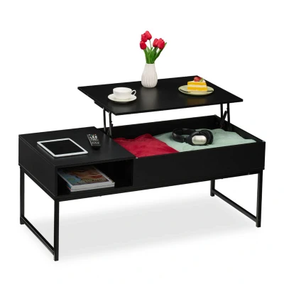 Relaxdays Coffee Table with Lift Top, Side Section, Compartment Storage Space, Wood Look, 45 x 110 50 cm, Black, Fibreboard, 56 cm