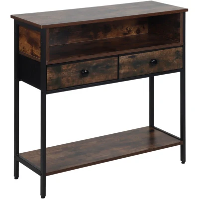Whether used as an entry table for keys and phones in the hall or as a side table for books, plants and décor in the living room, this console is extremely versatile. Two shelves, two drawers and an open compartment provide ample surface space, while the compact design means the narrow hallway console takes up very little room. The black metal frame combined with a decorative wood-look finish gives any space a modern industrial look. Console table in detail - Dimensions H x W x D: approx. 80 x 80 x 30 cm - Material: MDF, iron, non-woven, wood-look - Colour: brown, black Hallway table with drawers and shelves - Load capacity of upper shelf: approx. 25 kg - Internal dimensions of drawer H x W x D: approx. 10.5 x 37 x 27 cm - Load capacity of drawers: approx. 5 kg each - Dimensions of open compartment H x W x D: approx. 15.5 x 71.5 x 26.5 cm - Dimensions of lower shelf W x D: approx. 75 x 28 cm - Load capacity of lower shelf: approx. 10 kg - Distance between shelf and drawers: approx. 56