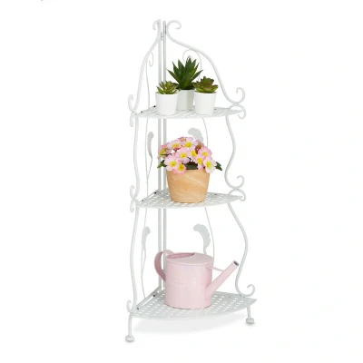 General description With its charming vintage look, the Relaxdays Corner Shelf is an eye-catcher in any room, whether it's the living room, kitchen, or hallway. This stylish shelf features 3 compartments that elegantly display your flowers, plants, and other decorative items. The shelf can be easily assembled in just a few steps and stands freely, allowing you to place it wherever you like. Additionally, it can be folded up for space-saving storage when not in use. Technical specifications Dimensions when set up (H x W x D): approx. 82.5 x 30 x 30 cm Dimensions when folded (H x W x D): approx. 82.5 x 30 x 5.5 cm Max. load per shelf: approx. 5 kg Weight: approx. 1.3 kg Material: Steel, polyamide Colour: White Top and middle shelf dimensions (W x D): approx. 23 x 23 cm Lower shelf dimensions (W x D): approx. 27 x 27 cm Distance between shelves: approx. 23.5 cm / approx. 28.5 cm Distance to floor: approx. 6.5 cm Usage The Relaxdays Corner Shelf is perfect for creating decorative space