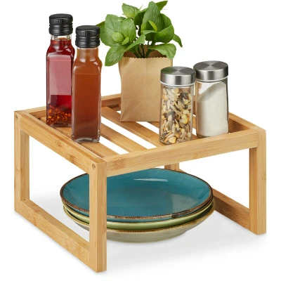 General description With the Relaxdays Cupboard Insert, you can create valuable storage space and bring order to kitchen chaos. This space-saving kitchen shelf is perfect for organizing spice jars, oil bottles, plates, and more. The free-standing design allows for flexible placement on the worktop or inside kitchen cupboards, while the bamboo finish adds a touch of natural charm to your kitchen. Technical specifications Dimensions (H x W x D): approx. 14 x 24.5 x 24.5 cm Dimensions of shelf (W x D): approx. 21.5 x 21.5 cm Space under tray (H x W): approx. 12 x 22 cm Load capacity: max. 2 kg Weight: approx. 400 g Material: bamboo Colour: natural Other information Included in delivery: 1x spice rack (decorative items not included)