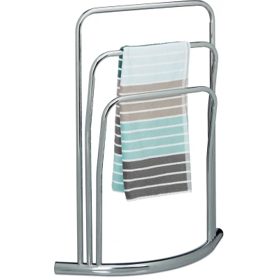 AmazonFree-standing towel holder with 3 towel rails to save space while drying hand towels and small bath towels - Also ideal as a clothes stand in the bedroom Functional - The staggered bars are optimal for air circulation - Your things will dry faster without developing strange odours Free-standing made of chromed, shiny metal in a stainless steel look - The modern and elegant design looks great in any bathroom Sturdy stand - The base prevents the rack from tipping over - No drilling required Quick and easy assembly with the included assembly instructions and materials - Total size: approx 85 x 66 x 20 cm (33.5 x 26 x 7.9 in) - length of rails: approx 50, 45 and 40 cm (19.7, 17.7 and 15.7 in) - Height of rails: approx 85, 72 and 57 cm (33.5 x 28.3 x 22.4 in)