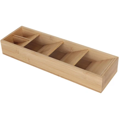 Bring order to your kitchen with this practical bamboo cutlery organiser. The space-saving design creates more storage space and, with its staggered layout, keeps your cutlery neatly arranged. The five differently sized compartments give knives, forks, spoons, teaspoons and cake forks a fixed place. The natural bamboo finish suits any kitchen and makes the organiser an eye-catcher on worktops. Cutlery organiser in detail - Dimensions H x W x D: approx. 6 x 40 x 12 cm - 2x small compartments W x D: approx. 8 x 4.5 cm - 3x large compartments W x D: approx. 10 x 10 cm - Material: bamboo, MDF - Colour: natural Practical cutlery tray for your kitchen - Space-saving design creates more storage space - Clear storage thanks to staggered compartments - 5 differently sized compartments for forks, spoons, knives & more - Natural look thanks to high-quality bamboo - Versatile use in drawers or on worktops Included in Delivery - 1x cutlery organiser - Decorative items are not included