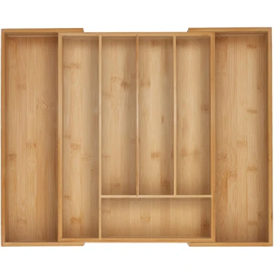 General description Cluttered kitchen drawers are a thing of the past with this cutlery tray made of natural bamboo. The drawer insert features multiple main compartments and 2 pull-out sections, providing ample space for cutlery and other kitchen utensils. This versatile cutlery organiser can also be used to store stationery, craft supplies, and more. With its adjustable width, the cutlery tray insert fits various drawer sizes perfectly. Note: Measure your drawer accurately to ensure a perfect fit for the tray. Technical specifications Dimensions (Model C): H x W x D: approx. 5 x 32.5–53.5 x 43 cm Weight: approx. 1.3 kg Material: Bamboo, silicone Colour: Natural Number of compartments: 5-7 or 7-9 compartments Other information Silicone feet ensure the cutlery tray stays securely in place Crafted from sturdy bamboo with a natural finish