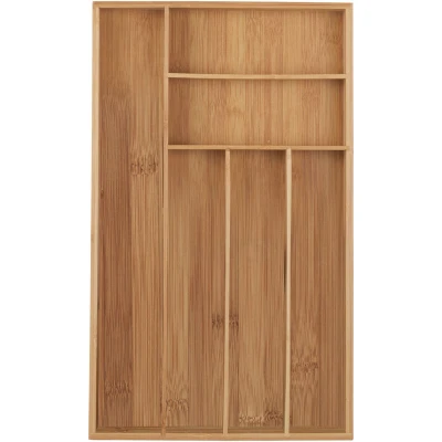 General description A cutlery tray is the optimal kitchen accessory for organizing and sorting knives, @@@aXswIfG9FY9j/dfD7uF+AuNDJ8W/Ic9o@@@, spoons, and other kitchen utensils. This practical cutlery drawer provides enough space for a variety of cutlery, craft supplies, or stationery in its 6 compartments. The natural bamboo tray is compact in size, making it the perfect drawer insert for medium or large-sized kitchen drawers. If the drawer needs cleaning, you can wipe it out with a damp cloth. Please ensure to measure your drawer accurately to assure the tray will fit, and check the length of your cutlery. Technical specifications Total size H x W x D: approx. 5 x 27.5 x 46 cm Small vertical compartments H x W x D: approx. 4.5 x 6 x 29.5 cm Large vertical compartment H x W x D: approx. 4.5 x 7 x 44.5 cm Size of horizontal compartment H x W x D: approx. 4.5 x 19 x 7 cm Weight: approx. 900 g Material: Bamboo, MDF Colour: Natural Other information Included in Delivery: 1 x cutlery drawer insert Decorative items are