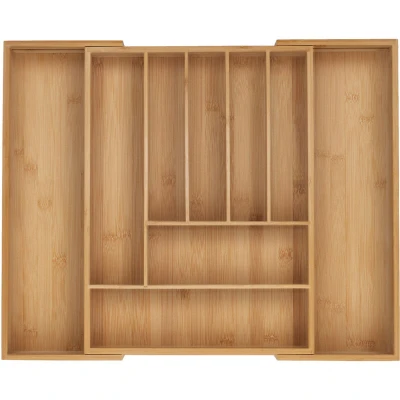 General description Cluttered kitchen drawers are a thing of the past with this cutlery tray made of natural bamboo. The drawer insert features multiple main compartments and 2 pull-out sections, providing ample space for cutlery and other kitchen utensils. This versatile cutlery organiser can also be used to store stationery, craft supplies, and more. With its adjustable width, the cutlery tray insert fits various drawer sizes perfectly. Note: Measure your drawer accurately to ensure a perfect fit for the tray. Technical specifications Dimensions (Model C): 5 x 32.5–53.5 x 43 cm Weight (Model C): approx. 1.3 kg Material: Bamboo, silicone Colour: Natural Number of compartments: 7-9 Other information Silicone feet ensure the cutlery tray stays securely in place Also ideal for storing craft supplies or office essentials
