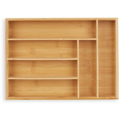 AmazonBamboo cutlery tray with 6 compartments - clever storage option for the kitchen Storage Store knives, forks, spoons and other kitchen utensils in a drawer insert Order All kitchen utensils in the cutlery insert at a glance - no need to rummage around in the drawer Versatile drawer insert for storing craft and sewing supplies and other small items Cutlery tray at a glance Total size H x W x D approx. 5 x 25.5 x 35.5 cm; size small side compartments H x W x D approx. 4 x 5.5 x 22 cm; size large side compartment H x W x D approx. 4 x 5.5 x 28 cm; size small cross compartment H x W x D approx. 4 x 18 x 5.5 cm; size large cross compartment H x W x D approx. 4 x 24 x 5.5 cm