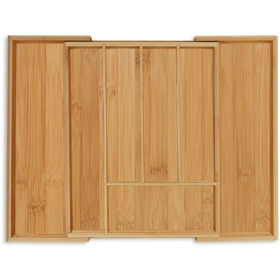 General description Untidy drawers are a thing of the past with this Relaxdays Cutlery Tray. This cutlery drawer insert features 5 main compartments and 2 pull-out compartments, providing ample space for silverware, large kitchen knives, and other cooking utensils. The sides extend to accommodate different drawer sizes, making it a versatile storage solution. Made from natural bamboo, it is both durable and decorative. Technical specifications Dimensions (max): H x W x D: approx. 5 x 44.5 x 35.5 cm Dimensions (min): H x W x D: approx. 5 x 28.5 x 35.5 cm Weight: approx. 1.7 kg Material: Bamboo, MDF Color: Natural Large compartment dimensions: H x W x D: approx. 3.5 x 6 x 32.5 cm Smaller compartment dimensions: H x W x D: approx. 3.5 x 6 x 23.5 cm (3 compartments) Horizontal compartment dimensions: H x W x D: approx. 3.5 x 18.5 x 8 cm Pull-out compartment dimensions: H x W x D: approx. 4 x 8 x 34 cm (2 compartments) Compatibility and accessories This cutlery tray fits many drawer types