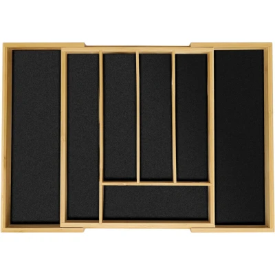 General description Cluttered kitchen drawers are a thing of the past with this Relaxdays Cutlery Tray. The drawer insert features 5 main compartments and 2 pull-out compartments, providing ample space for cutlery, larger kitchen knives, and various cooking utensils. Thanks to its individually adjustable width, this cutlery tray adapts to different drawer sizes, ensuring a perfect fit. Technical specifications Dimensions when pushed together (H x W x D): approx. 5 x 28.5 x 33 cm Weight: approx. 1.1 kg Max. total width when extended: approx. 47 cm Internal dimensions of compartments: 3 main compartments (H x W x D): approx. 3.5 x 6 x 22.5 cm Small compartment (H x W x D): approx. 3.5 x 18.5 x 6.5 cm Large compartment (H x W x D): approx. 3.5 x 6 x 29.5 cm 2 pull-out compartments (H x W x D): approx. 4.5 x 9.5 x 31 cm Material: Bamboo, MDF Colour: Natural, black Installation Measure your drawer accurately to ensure a proper fit for the cutlery tray. Simply insert the tray into the