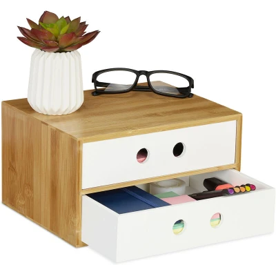 Relaxdays Desk Organiser, 2 Drawers, Office Storage Box, HxWxD: 14 x 25 20 cm, Bamboo & MDF, White, 60% fibreboard 40%