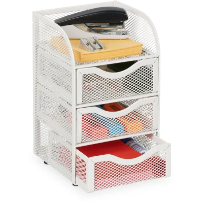 General description The Relaxdays Desk Organiser is a practical solution to declutter your workspace. With its modern mesh design and sturdy metal construction, this organiser features 4 compartments that provide ample space for storing office essentials such as tape, notepads, and paper clips. The white finish adds a contemporary touch, ensuring that your office accessories are easily accessible and neatly arranged. Technical specifications Overall dimensions (H x W x D): 21 x 12.5 x 13 cm Dimensions of top compartment (H x W x D): 4 x 12 x 12 cm Dimensions of each drawer (H x W x D): 4 x 11.5 x 11.5 cm Weight: 0.8 kg Material: Steel Colour: White Other information Practical anti-slip base prevents scratches Included in delivery: 1x desk organiser (decorative items not included)