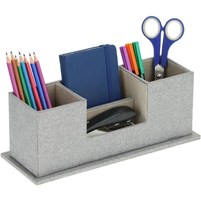 This elegant desk organiser is the ideal addition to your desk in the office or home office. Its decorative fabric look makes it a real eye-catcher. Keep things tidy in no time with the pen organiser. Pens, sticky notes, mobile phone and other office utensils are neatly stored in the desk organiser. The 4 compartments of the pencil box can also hold cosmetic items and brushes. Desk Organiser in Detail - Overall dimensions H x W x D: approx. 11 x 29.5 x 11 cm - Weight: approx. 0.4 kg - Material: plastic, MDF, polyester - Colour: grey - Total inner dimensions H x W x D: approx. 10 x 26.5 x 7.5 cm - Dimensions outer compartments H x W x D: approx. 10 x 7.5 x 7.5 cm - Dimensions of high compartment H x W x D: approx. 6 x 10.5 x 3.5 cm - Dimensions deep compartment H x W x D: approx. 3.5 x 10.5 x 3 cm Elegant Desk Organiser in Fabric Look - Keeps your desk tidy and organised - 4 compartments for office utensils such as pens, notepads etc. - Elegant look with fabric aesthetic - Ideal for