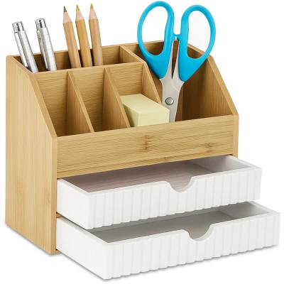 Relaxdays Desk Organiser, Drawers & Compartments, HxWxD: 19 x 24 14 cm, Bamboo MDF, Office Storage, Natural/White