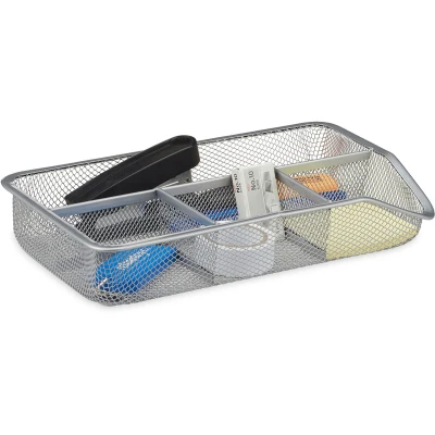 General description This desk organizer helps you conquer chaos in your office with its efficient design. Featuring 4 compartments of varying sizes, it is perfect for storing pens, brushes, letters, and paperclips. Its flat and compact shape makes it an ideal drawer insert, while rounded edges allow for easy retrieval of notes. Made entirely of robust metal, this organizer combines functionality with a sleek, eye-catching design. Technical specifications Dimensions: H x W x D: approx. 4.8 x 27.5 x 16 cm Left compartment inner size: H x W x D: approx. 4.5 x 8.5 x 7.5 cm Medium compartment inner size: H x W x D: 4.5 x 8.5 x 7.5 cm Right compartment inner size: H x W x D: approx. 4.5 x 8.5 x 7.5 cm Rear compartment inner size: H x W x D: 4.5 x 26 x 7.5 cm Weight: approx. 0.3 kg Other information Includes: 1 x Desk Organizer Decorative items shown in product photos are not included