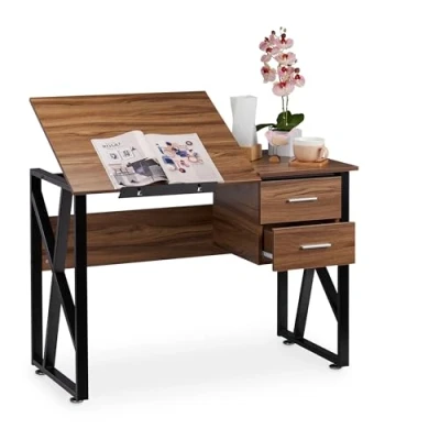 Function: Desk with adjustable angle of worktop surface for either PC, laptop or art work Shape: Rectangular desk with following dimensions HWD 75x110x55cm - For at home, work or studio Practical: Laptop and drawing desk in one with affixable holder - Holds writing and drawing tools For storage: 2 drawers for all your required needs - Storage solution and modern Versatile: The tilting desk top surface turns a normal desk into a drawing table - Iron frame for sturdiness